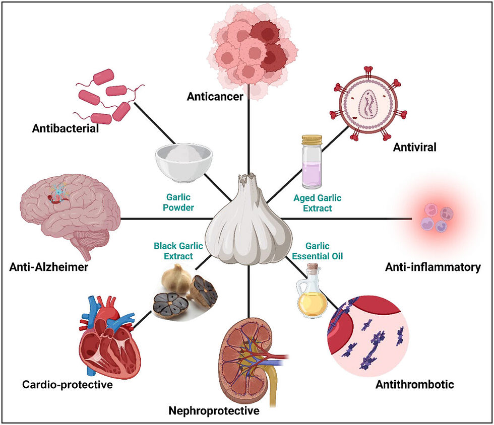 Beberapa studi eksperimental dan review, termasuk yang dimuat di jurnal Nutrients (2020), menunjukkan bahwa senyawa sulfur dari bawang putih dapat: